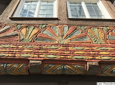 Гуляя по улицам города, путешественник может вдоволь насладится живописными фахверками с орнаментом на фасадах и цветами в окнах. Как видно на фотографиях, все дома имеют большой входной проём для того, чтобы в старину в них могла въехать повозка, карета, или, как ни странно, пройти пару коров, которые вплоть до 19 века содержались на первых этажах этих великолепных "пряничных" домиков.